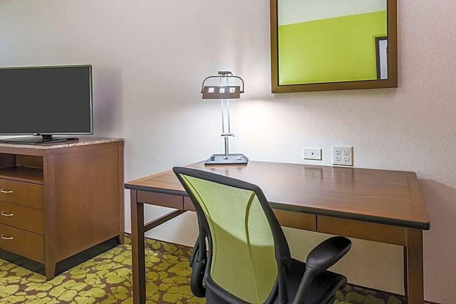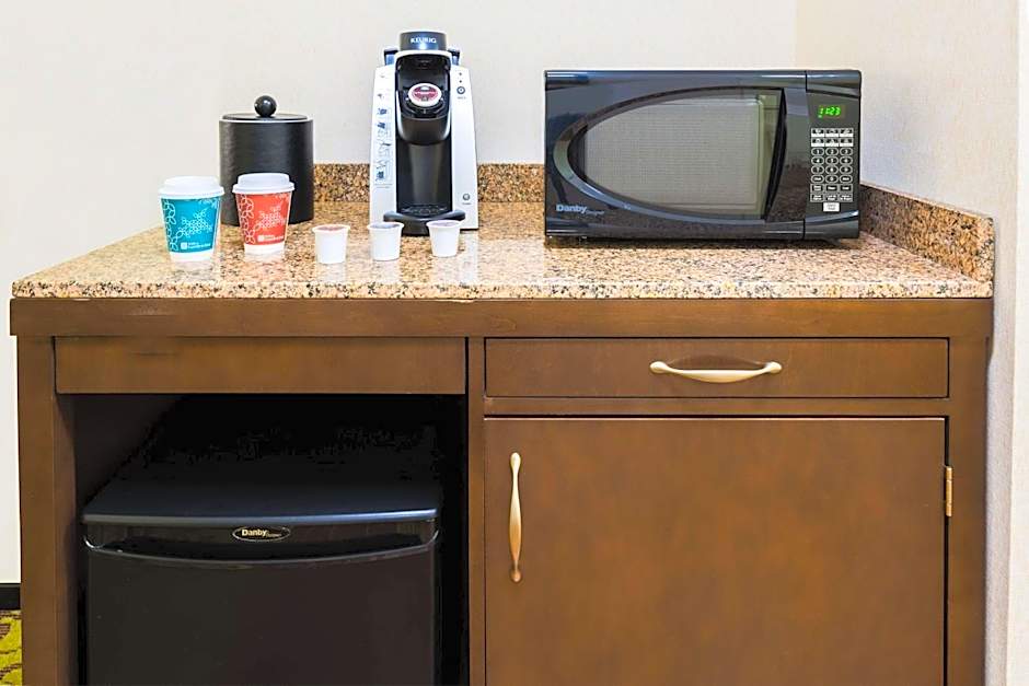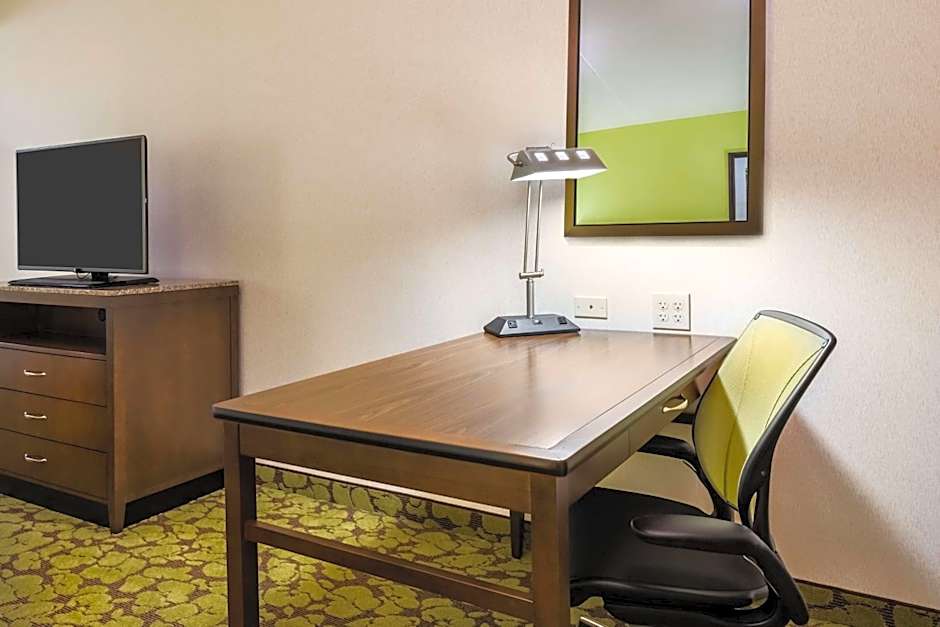 This room features a work desk, a flat-screen TV, a small refrigerator, and a microwave.
